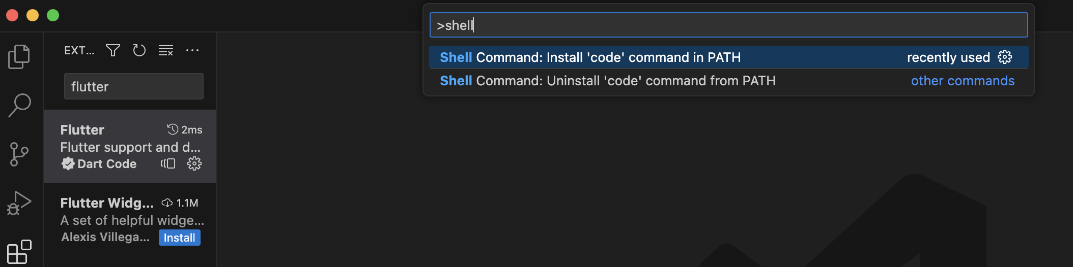 shell 검색하면 code 명령어를 쉘에 설치해주는 옵션이 보인다.